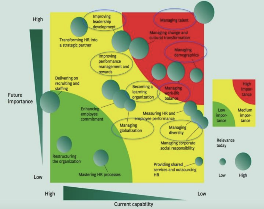 Das Portfolio basiert auf einer Umfrage von 1.355 Führungskräften aus 27 verschiedenen Ländern und zeigt auf, welche Management-Faktoren in Unternehmen von hoher Relevanz sind. Die besonders wichtigen Faktoren sind mit einem roten Feld hinterlegt. Eine eher geringere Bedeutung haben Faktoren, welche grün hinterlegt sind und die gelbe Fläche kennzeichnet Faktoren, die eine mittelmäßige Relevanz in Unternehmen aufweisen. Die Größe der dunkelgrünen Kreise unterscheidet innerhalb der Farbpalette nochmals zwischen hoher und niedriger Bedeutung der jeweiligen Management Faktoren. Auf der X-Achse ist eingetragen, in welcher Intensität die Faktoren aktuell (zum Zeitpunkt der Umfrage) im Unternehmen umgesetzt sind (current capability). Die Y-Achse spiegelt das zukünftige Wachstumspotenzial der Bedeutung dieser Faktoren wieder (future importance).